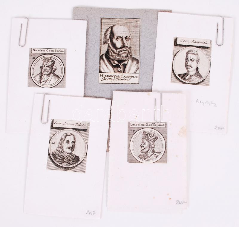 cca 1700 Magyar történelmi személyiségek kisméretű arcképei. 5 db rézmetszet. Ragotzky, Lajos király, Tököly, Zrínyi / Etcings of Hungarian historical persons