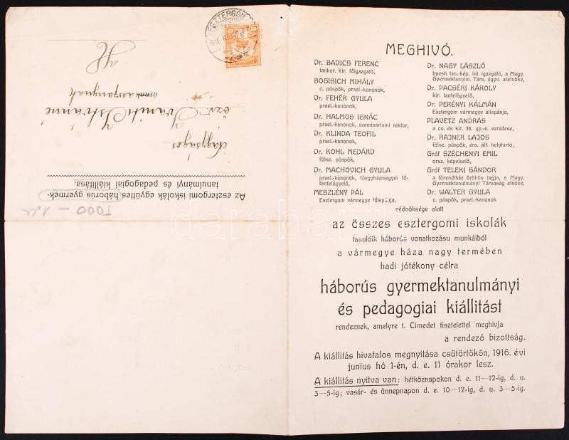 Leírás: 1916 Meghívó az esztergomi iskolák együttes háborús gyermektanulmányi és pedagógiai kiállítására