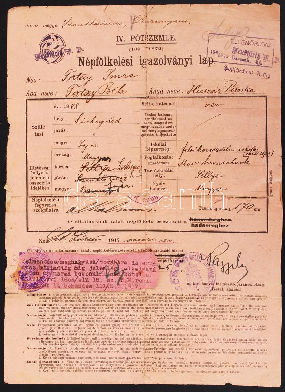 1917 Népfölkelési igazolványi lap https://www.darabanth.com/hu/193-Gyorsarveres/193.0/Festmeny-mutargy-papirregiseg-egyeb/Militaria~200023/1917-Nepfolkelesi-igazolvanyi-lap~II721432