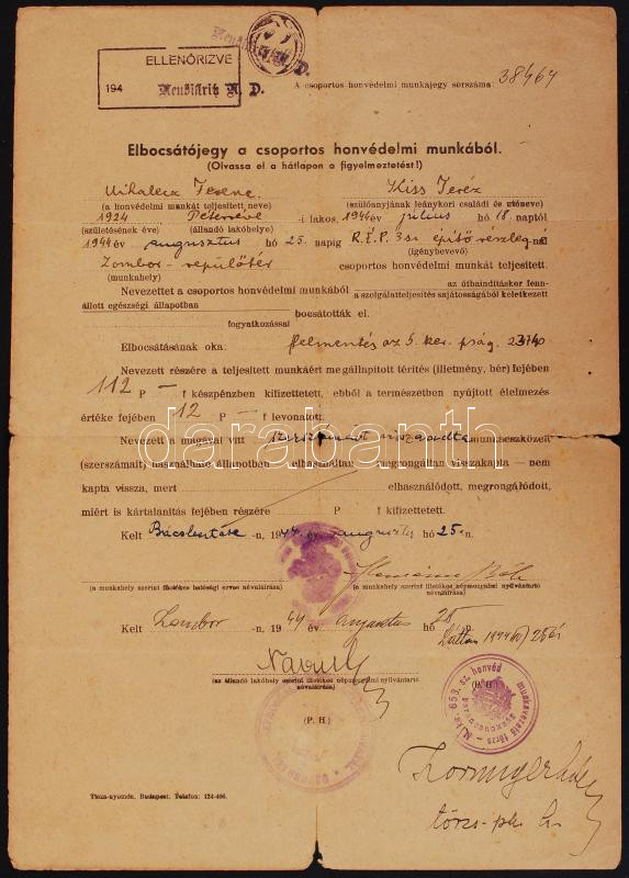 1944 Elbocsátójegy a csoportos honvédelmi munkából https://www.darabanth.com/hu/193-Gyorsarveres/193.0/Festmeny-mutargy-papirregiseg-egyeb/Militaria~200023/1944-Elbocsatojegy-a-csoportos-honvedelmi-munkabol~II721426