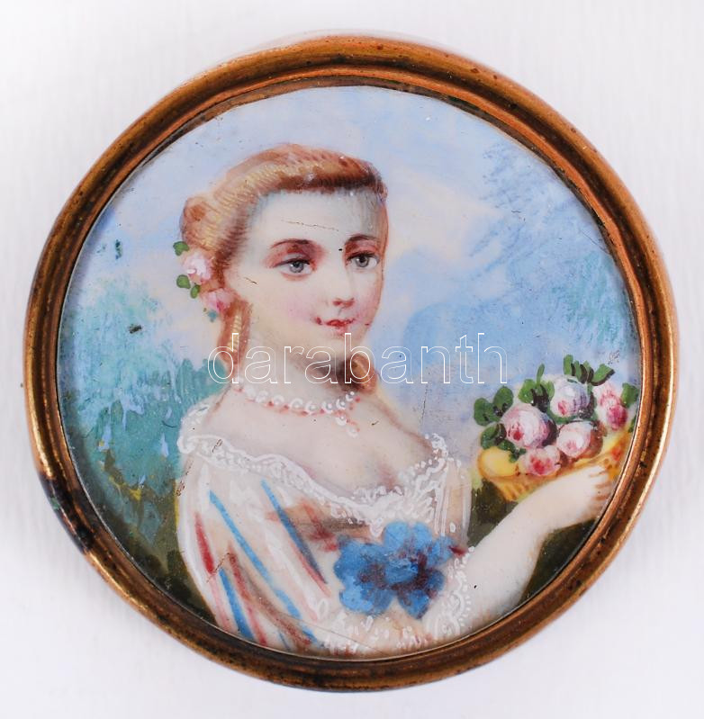 Hölgy virággal. Csontra festett miniatúra, réz kitűzőben, jelzés nélkü... https://www.darabanth.com/hu/193-Gyorsarveres/193.0/Festmeny-mutargy-papirregiseg-egyeb/Mutargyak-antikvitas~200003/Holgy-viraggal-Csontra-festett-miniatura-rez-kituzoben-jelzes-nelkul-d4-cm~II705571