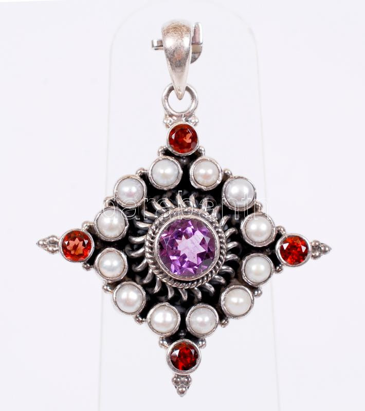 Leírás: Női ezüst függő (Ag.) csiszolt gránáttal és gyöngysorral, középen csiszolt ametiszttel, jelzett, 4×3 cm, bruttó: 14,3 g