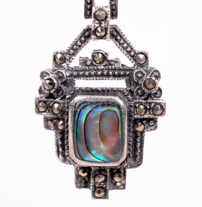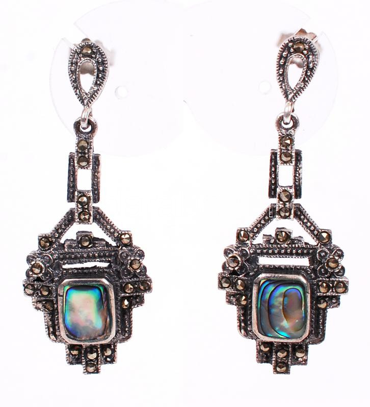 Leírás: Női ezüst fülbevaló pár (Ag.) markazittal és pankagyló díszítéssel, h:4 cm, bruttó: 8,3 g