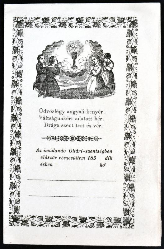 Leírás: cca 1850 Emlék az első szent áldozásra. Kitöltetlen emléklap 2db fametszettel, 16x10,5cm