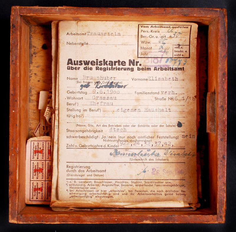 Leírás: Cca 1920 Német étkezési jegyek, igazolványok, stb, fa dobozban, 13×13 cm