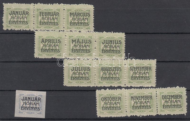 Leírás: 1910 Budapesti Közlekedési és Vasút társaság havi érvényességű bélyegei, 13 db összefüggésekkel
