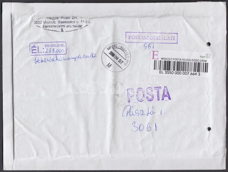2 db postaszolgálati ragjegyes boríték értékküldeményekről "B" ill. "E" ragjeggyel ellátva. A levelek Kazincbarcika 1 és Miskolc 2 postai pecsétekkel lezárva.