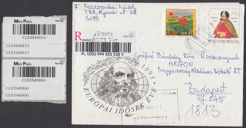 2005 ajánlott levél 3073 TAR Posta biancos ragjegyével és a címzett érkeztetési bélyegzőjével ellátva. Csatolva a könyvelt küldemény feladóvevénye is + 2 db Mini Pakk ragjegy