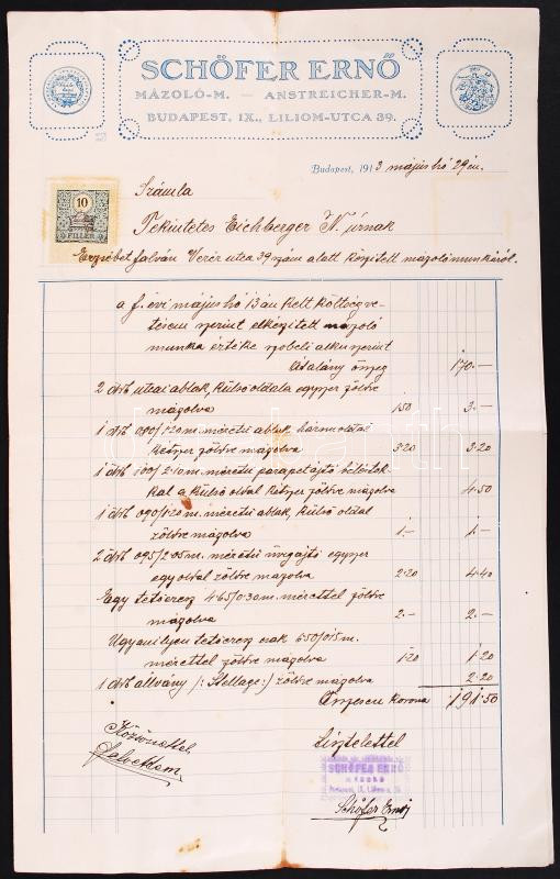 Leírás: 1913 Bp. X. Schöffer Ernő mázoló fejléces számla