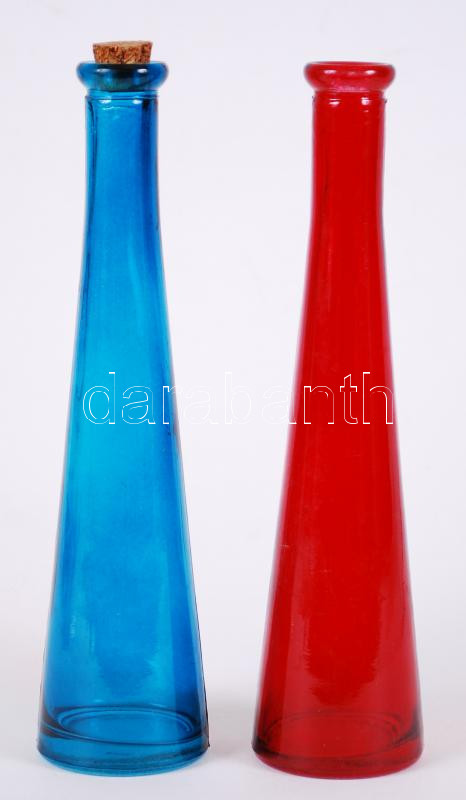 Leírás: 2 db színes üveg ecetkiöntő, egyikhez dugó, m:23 cm