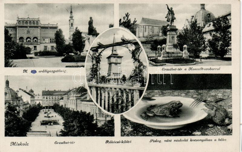 Leírás: Miskolc, Erdőigazgatóság, Erzsébet tér, Kossuth szobor, Rákóczi kilátó; pislog, mint miskolci kocsonyában a béka (fa)