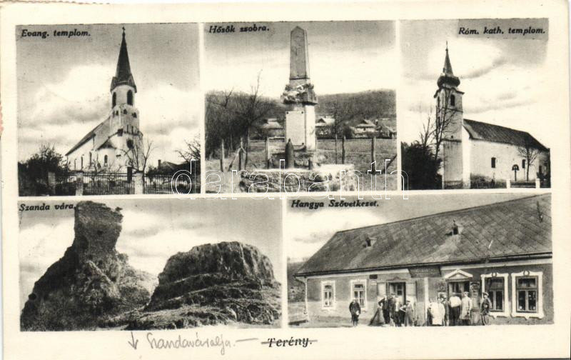 Leírás: Terény Hangya szövetkezet, Szanda vára, templomok