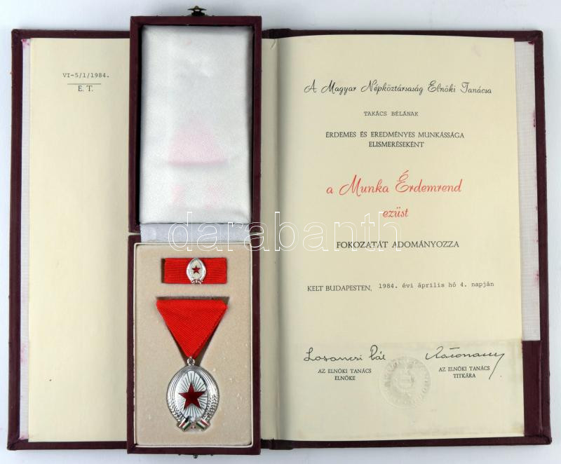 1984. A Munka Érdemrend ezüst fokozata dísztokban adományozói oklevéll... https://www.darabanth.com/hu/193-Gyorsarveres/193.0/Numizmatika/Falerisztika-Kituntetesek-jelvenyek~17/1984-A-Munka-Erdemrend-ezust-fokozata-disztokban-adomanyozoi-oklevellel-Losonczi-Pal-alai~II685543