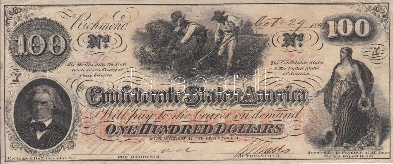 Amerikai Konföderációs Államok / Richmond 1864. október 29. 100$ vízjeles papír, piros sorozat és sorszám, fekete keltezés. Hátlapon két különféle fekete bélyegzés Tallahassee / Boston T:III