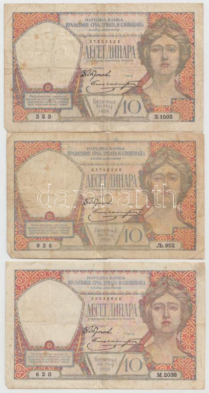 Yugoslavia 1926. 10 Dinara (3x) C:F https://www.darabanth.com/hu/193-Gyorsarveres/193.0/Numizmatika/Kulfoldi-bankjegyek~11/Jugoszlavia-1926-10D-3x-TIII-3Cbr3EYugoslavia-1926-10-Dinara-3x-CF~II737303