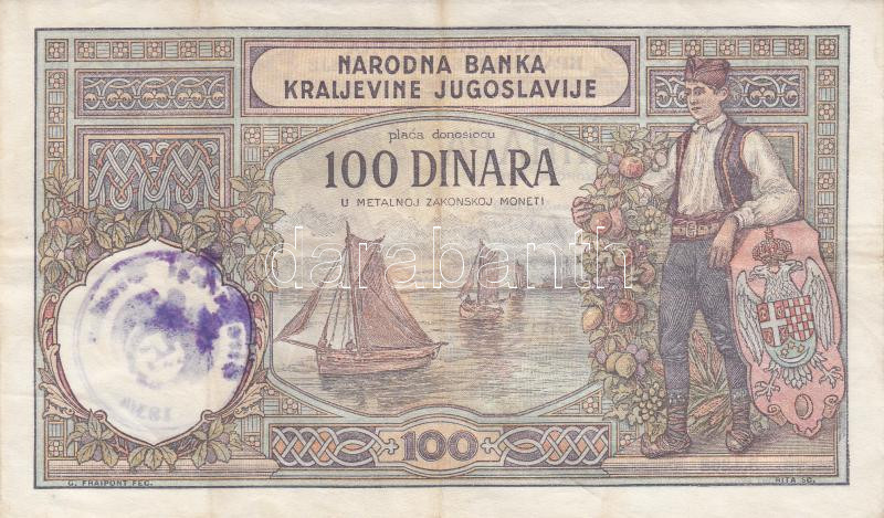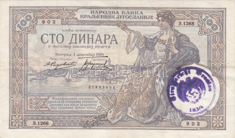 Yugoslavia 1929. 100 Di... https://www.darabanth.com/hu/193-Gyorsarveres/193.0/Numizmatika/Kulfoldi-bankjegyek~11/Jugoszlavia-1929-100D-felulbelyegzessel-TIII-3Cbr3EYugoslavia-1929-100-Dinara-overprint-CF~II719125