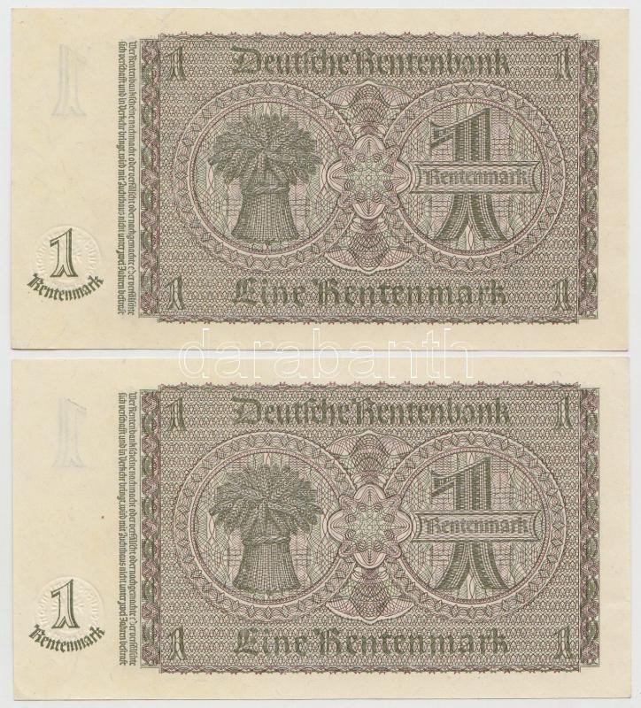 German Third Reich 1937. 1 Rentenmark (2x) sequential serials C:UNC