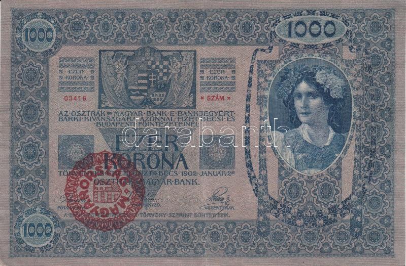 1902. 1000K (2x) mindkettő piros "Magyarország" körbélyegzőv... https://www.darabanth.com/hu/193-Gyorsarveres/193.0/Numizmatika/Magyar-bankjegyek~7/1902-1000K-2x-mindketto-piros-Magyarorszag-korbelyegzovel-ketfele-szinvaltozat-TII-I~II736300