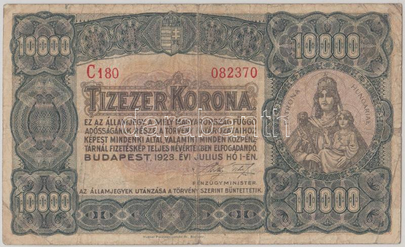 1923. 10.000K "Magyar Pénzjegynyomda Rt." T:III/III- https://www.darabanth.com/hu/193-Gyorsarveres/193.0/Numizmatika/Magyar-bankjegyek~7/1923-10000K-Magyar-Penzjegynyomda-Rt-TIIIIII-~II735355