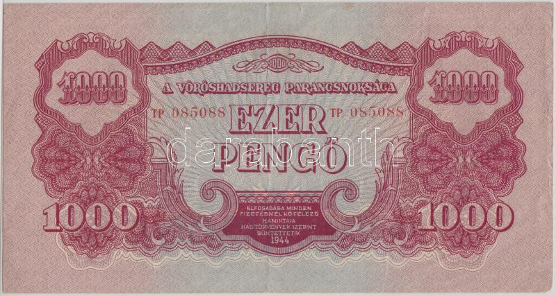 1944. 1000P "A Vöröshadsereg Parancsnoksága" T:III https://www.darabanth.com/hu/193-Gyorsarveres/193.0/Numizmatika/Magyar-bankjegyek~7/1944-1000P-A-Voroshadsereg-Parancsnoksaga-TIII~II735304