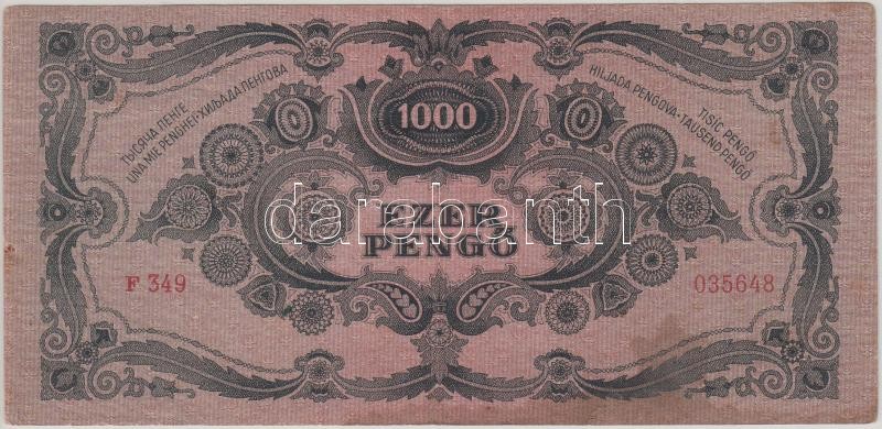 Leírás: 1945. 1000P vörös "MNB" bélyeggel, sorozatszámban egyenes tetejű 3-as szám T:III