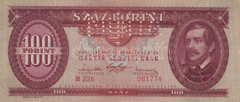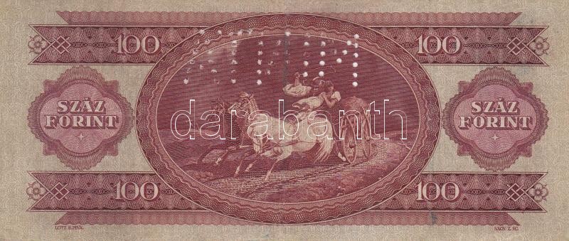 Leírás: 1947. 100Ft "MINTA" perforációval(részleges) "B 226 081774" sorszámmal T:restaurált