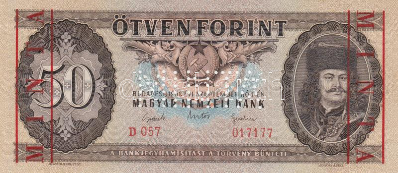 Leírás: 1951. 50Ft "MINTA" perforációval és felülnyomással "D 057 017177" sorozatszámmal T:I