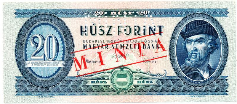Leírás: 1957. 20Ft "MINTA" perforáció és felülnyomás "C127 085582" T:I