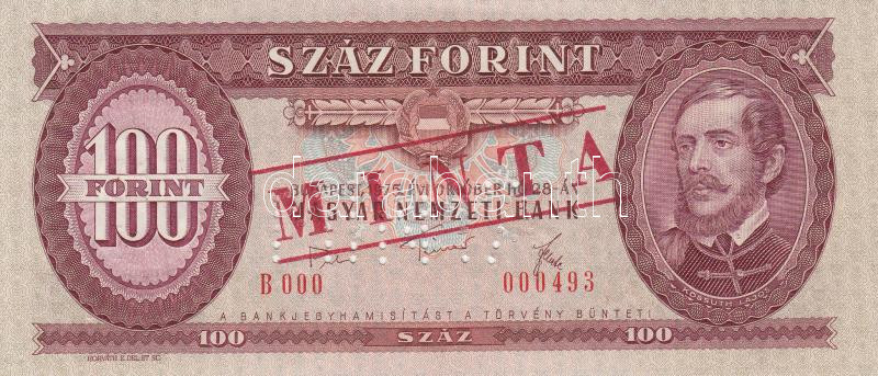 Leírás: 1975. 100Ft "MINTA" perforációval és felülnyomással, "B 000 000493" T:I