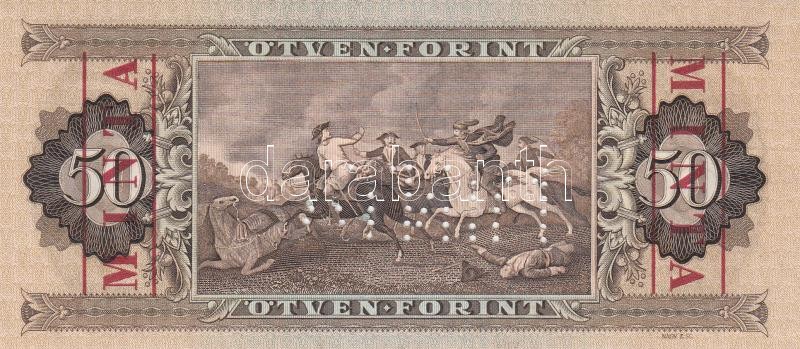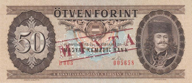 Leírás: 1975. 50Ft "MINTA" perforációval és felülnyomással "D 003 005658" átlósan végighúzódó nyomdai papírránccal T:I