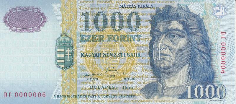 1999. 1000Ft "DC 0000006" T:I https://www.darabanth.com/hu/193-Gyorsarveres/193.0/Numizmatika/Magyar-bankjegyek~7/1999-1000Ft-DC-0000006-TI~II735435