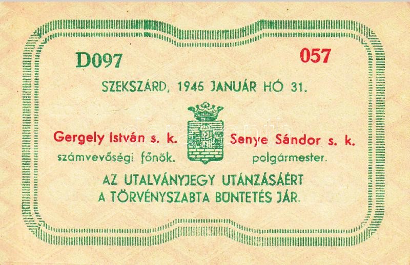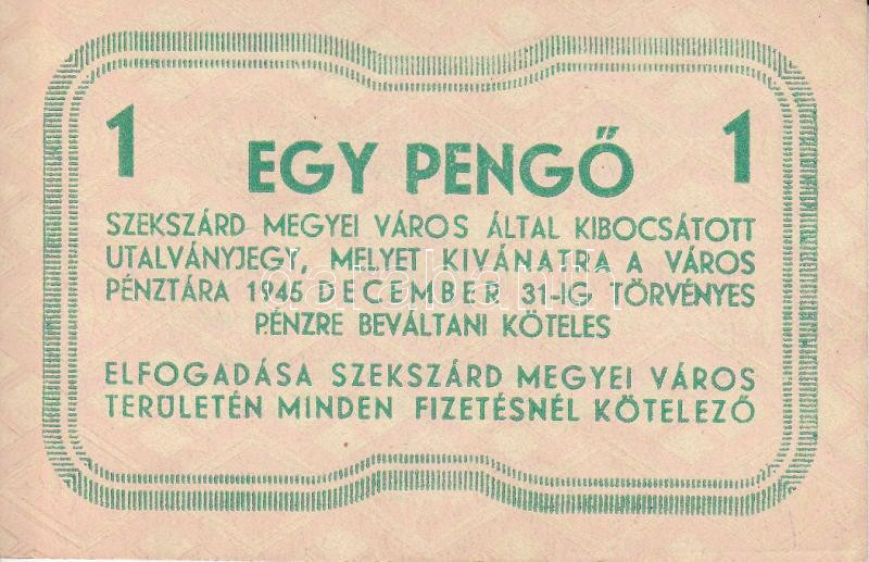 Leírás: Szekszárd 1945. Utalványjegy 1P értékben T:I-