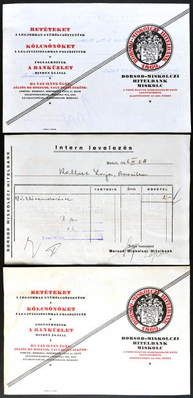 Leírás: 1943-1944. "Borsod-Miskolczi Hitelbank" reklámmal ellátott Intern levelezés 3klf darabja. Szign.: KNER I., GYOMA T:II,II-