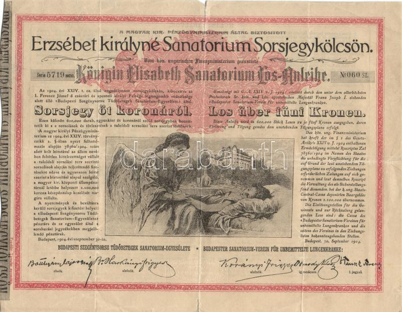 1904. "Erzsébet királyné Sanatorium Sorsjegykölcsön" sorsjeg... https://www.darabanth.com/hu/193-Gyorsarveres/193.0/Numizmatika/Reszvenyek-es-sorsjegyek~22/1904-Erzsebet-kiralyne-Sanatorium-Sorsjegykolcson-sorsjegye-5K-rol-TIII~II657481