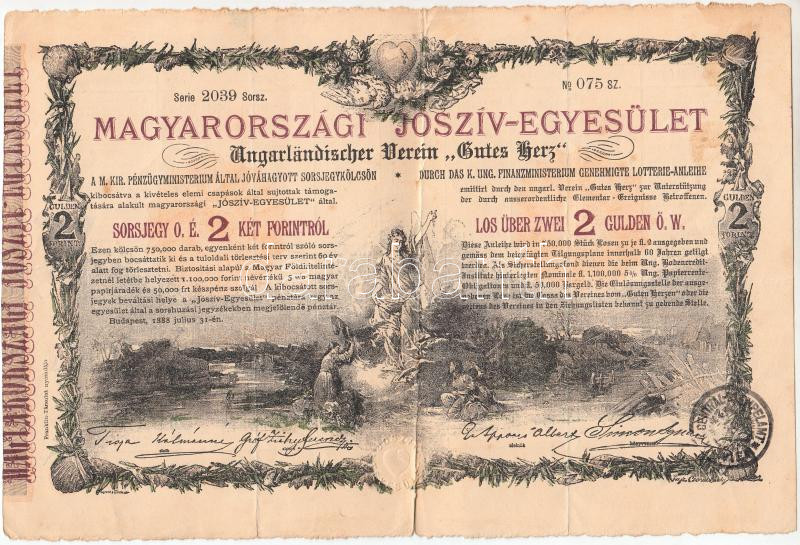 Leírás: Budapest 1888. "Magyarországi Jószív Egyesület" sorsjegye, pecsételéssel 2Ft-ról magyar és német nyelven (2x) T:III
