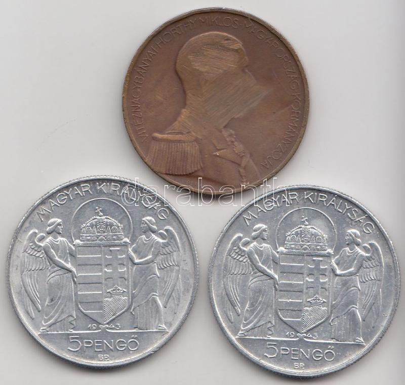 Hungary 1939. "Bronze Medal for Bravery" bronze decoration without ribbon, damaged C:F + 1943. 5 Pengő (2x) C:XF