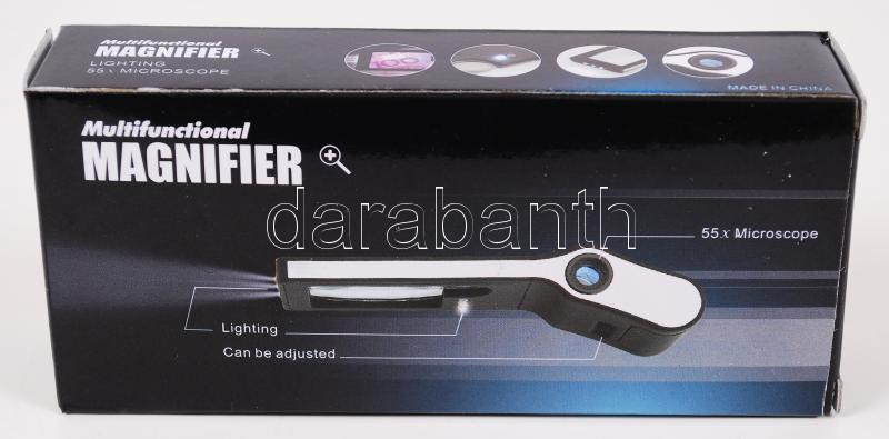 Leírás: Magnifier multifunkcionális nagyító 55x nagyítás, led lámpával, hozzá fekete tok, új állapotban, eredeti csomagolásban / Magnifier