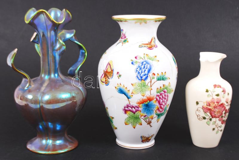 Leírás: Restaurátor tétel, Zsolnay eozin és virág mintás váza, Herendi Viktória mintás ragasztott váza, m:23 cm, m:16 cm