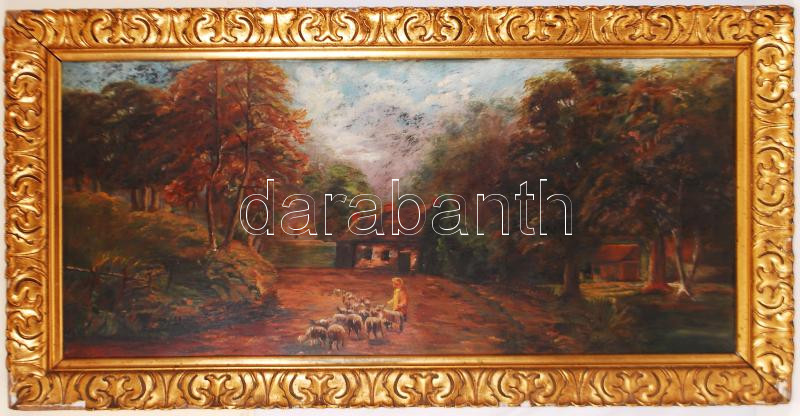 Leírás: Jelzés nélkül: Legeltető kislány. Olaj, fémlemez, antik sérült keretben, 58×114 cm