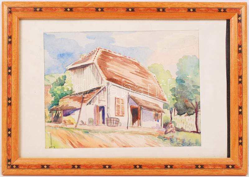 Olvashatatlan jelzéssel: Ház a dobon. Akvarell, papír, üvegezett keret... https://www.darabanth.com/hu/194-Gyorsarveres/194.0/Festmeny-mutargy-papirregiseg-egyeb/Festmenyek-es-grafikak~600001/Olvashatatlan-jelzessel-Haz-a-dobon-Akvarell-papir-uvegezett-keretben-16C39721-cm~II741589