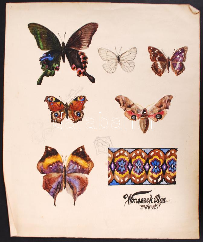 Wonaszek Olga: Lepkék és minták. Akvarell, papír, jelzett, 35×29 cm https://www.darabanth.com/hu/194-Gyorsarveres/194.0/Festmeny-mutargy-papirregiseg-egyeb/Festmenyek-es-grafikak~600001/Wonaszek-Olga-Lepkek-es-mintak-Akvarell-papir-jelzett-35C39729-cm~II740786