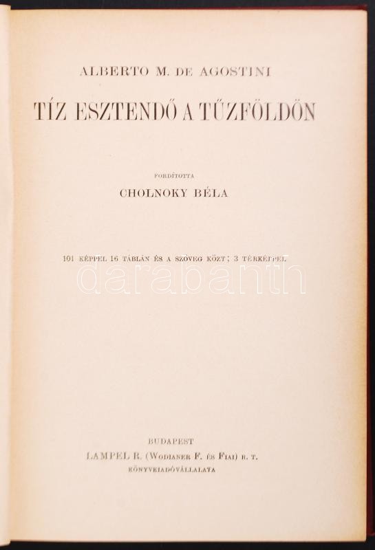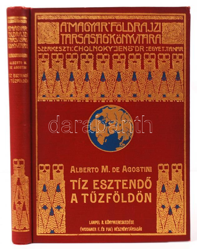 Magyar Földrajzi Társaság Könyvtára: Alberto M. de Agostini: Tíz esztendő a Tűzföldön 100 képpel és 3 térképpel. Bp., é.n., Lampel és Wodianer. Aranyozott kiadói egészvászon kötésben. Nagyon szép állapotban