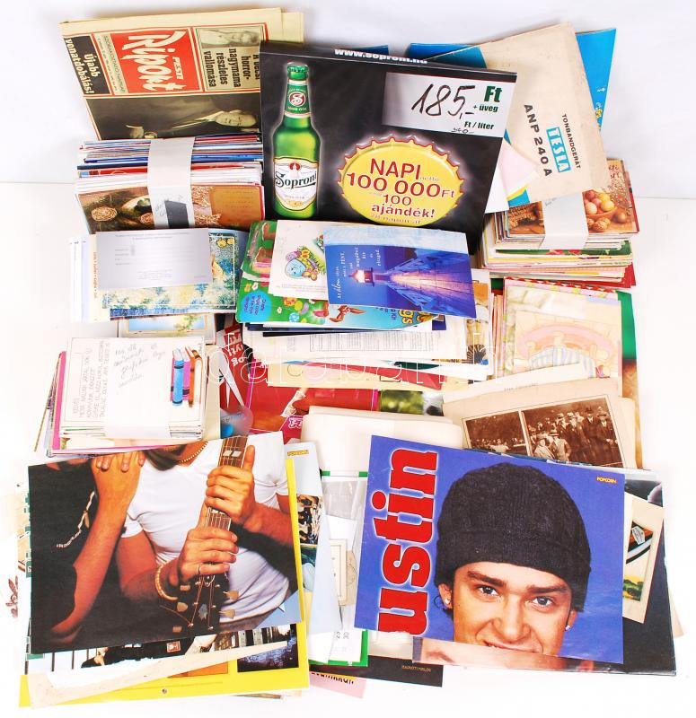 Leírás: Egy doboznyi modern nyomtatvány, reklám és több száz üdvözlőlap