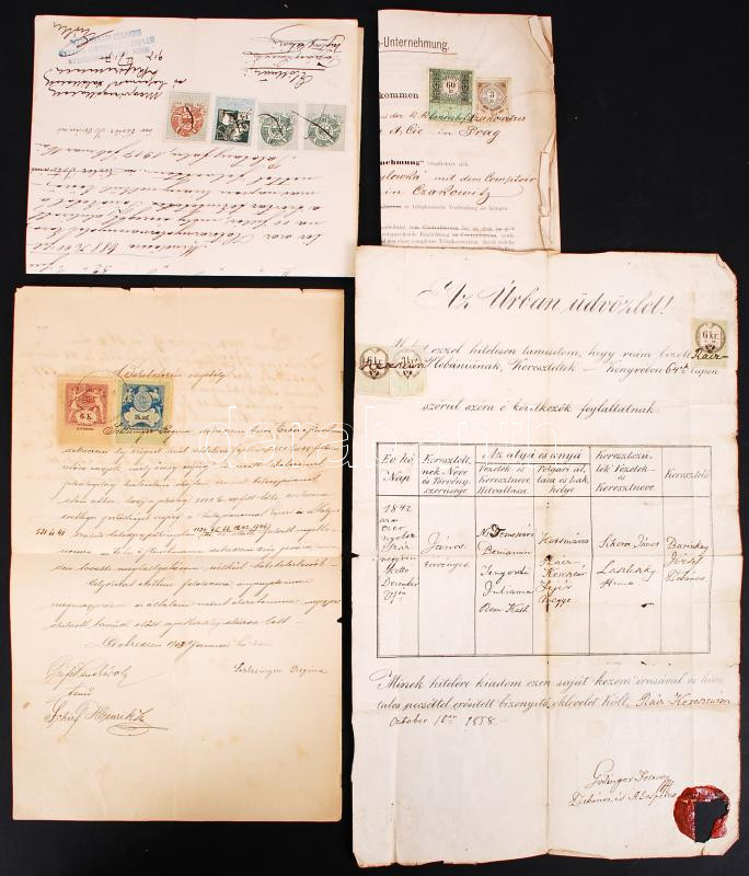 Leírás: 1858-1917 4db hivatalos okirat okmánybélyegekkel