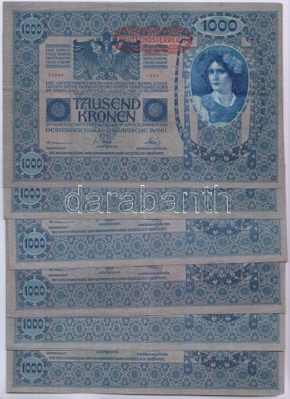 Leírás: 1902. 1000K mindkét oldal német, "Deutschösterreich" felülnyomással (7x) T:III(kétszer hajtottak, de szép papír)