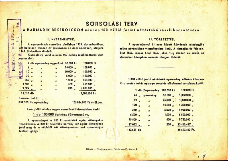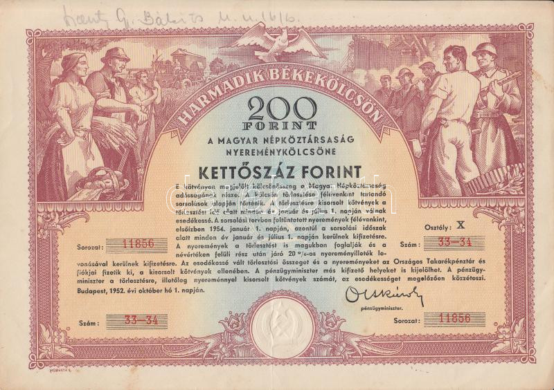 Leírás: 1952. "Harmadik Békekölcsön" nyereménykölcsön 200Ft-ról T:II-
