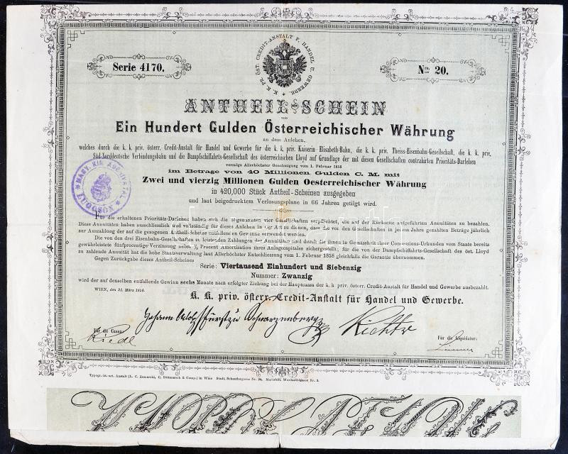 Ausztria/Bécs 1858. "K.K. Österrechische Credit-Anstalt für Handel und Gewerbe" részvénye 100G értékben T:III
