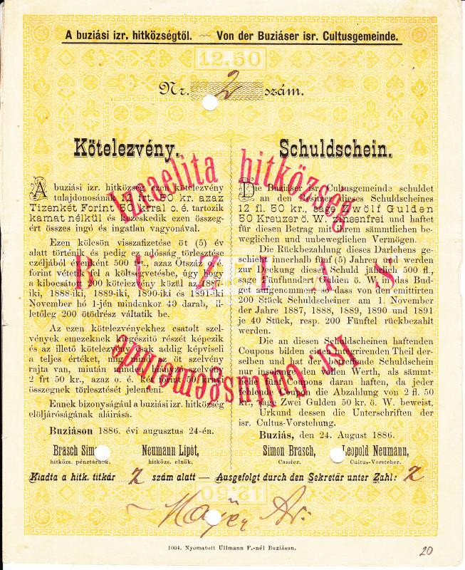 Leírás: Buziás 1886. A buziási izraelita hitközség kötelezvénye 15Ft 50Kr-ról lyukasztással
