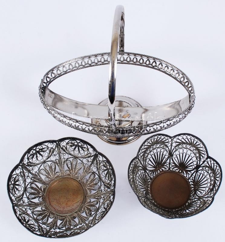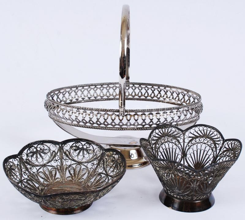 Leírás: 2 db filigrán fém kosárka + fém füles kosár üveg nélkül, d:11 és 13 cm, h:22 cm és m:20 cm