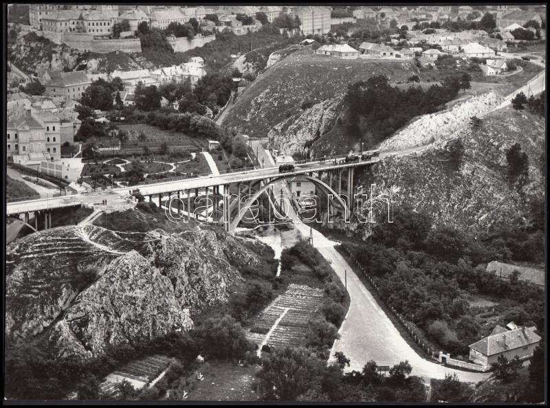1975 Rév Miklós: Viadukt Veszprémben. Vintage légi fotó, jelzés nélkül. A Magyarország ma című fotókiállításon szerepelt 1975-ben, a Magyar Munkásmozgalmi Múzeumban, a kiállítás katalógusában megtalálható, 18x24cm